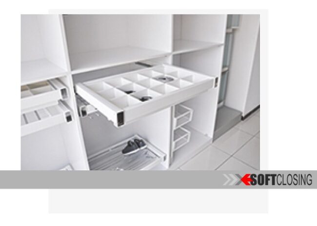 Półka na buty z prowadnicami łożyskowymi. Dostępna trzech rozmiarach: W-3319-400 L= 450-600 mm W-3319-480 L= 540-700 mm W-3319-400 L= 720-780 mm w dwóch wersjach kolorystycznych: P-22- SREBRNY i P-22- SZARY. Wysokość: 195 mm Głębokość: 521 mm