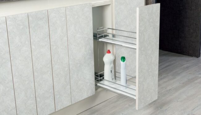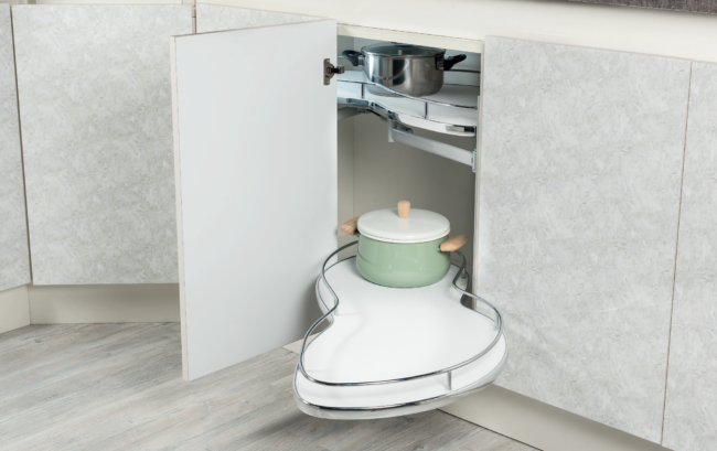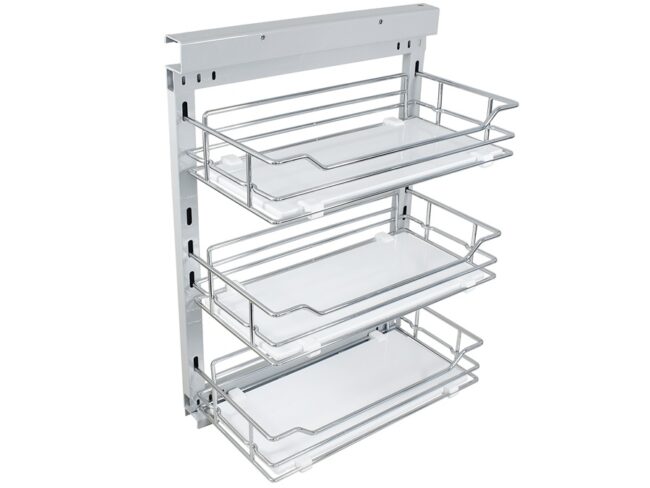 Półka narożna „NERKA” do frontu 600mm prawa/ lewe. Dwie niezależne białe półki z chromowanym relingiem. Ładowność koszy 20 kg. Montaż boczny na szarym stelażu. Tłok spowalniający umieszczony w mechanizmie nośnym. Możliwość regulacji wysokości poziomów. S-3123-C LEWA S-3124-C PRAWA Wymiary: Szerokość: 910mm Głębokość: 510mm Wysokość: 600mm Link do filmu montażowego.