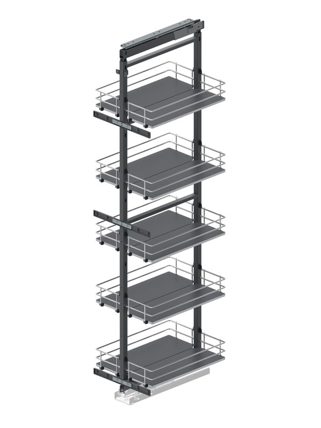 Cargo Midi dolne Linia Maxima SILVA 1200-1400 4 kosze firmy Rejs – przeznaczone do szafki o szerokości 40 cm. Kolor – stelarz grafitowy, półki metalowe chromowane a dno z płyty w kolorze grafitowym. Prowadnica Fulterer z pełnym wysuwem i miękkim domykiem montowane do dna korpusu. Maksymalne obciążenie kosza 120 kg. Istnieje możliwość zamontowania dodatkowej półki…