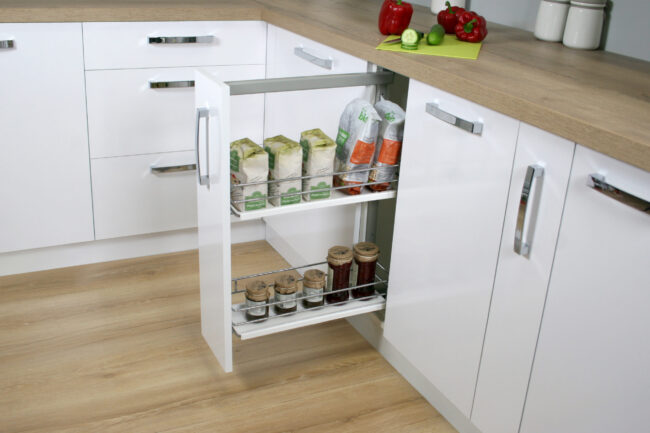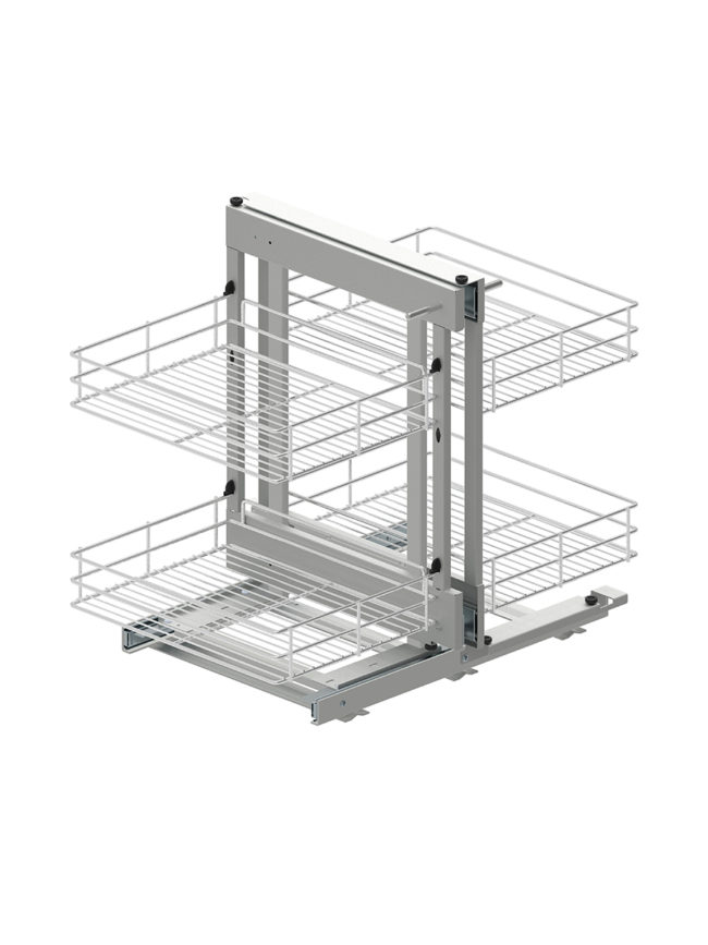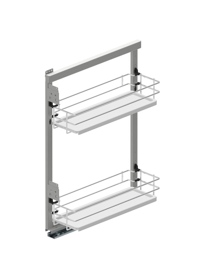 Cargo mini dolne Linia Maxima EVO firmy Rejs – przeznaczone do szafki o szerokości 40 cm – 2 poziomowe. Kolor – półki białe wykonane z tworzywa sztucznego, stelaż w kolorze lakier srebrny. Prowadnice firmy Rejs z pełnym wysuwem i miękkim domykiem dł. 45 cm. Montaż prowadnic do dna korpusu i prowadnika rolkowego do góry korpusu. Maksymalne…