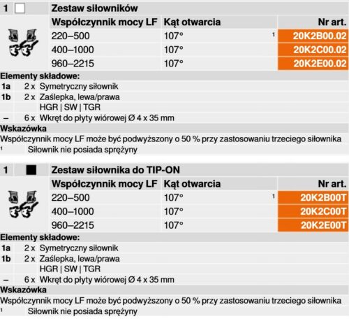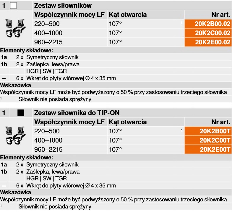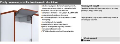 Zaślepki są dostępne w kolorze jedwabiście białym i jasnoszarym. Wiele zintegrowanych funkcji, takich jak ogranicznik kąta otwarcia lub BLUMOTION ułatwia montaż i użytkowanie AVENTOS HK-S. TIP-ON otwiera fronty bez uchwytów całkowicie mechanicznie.