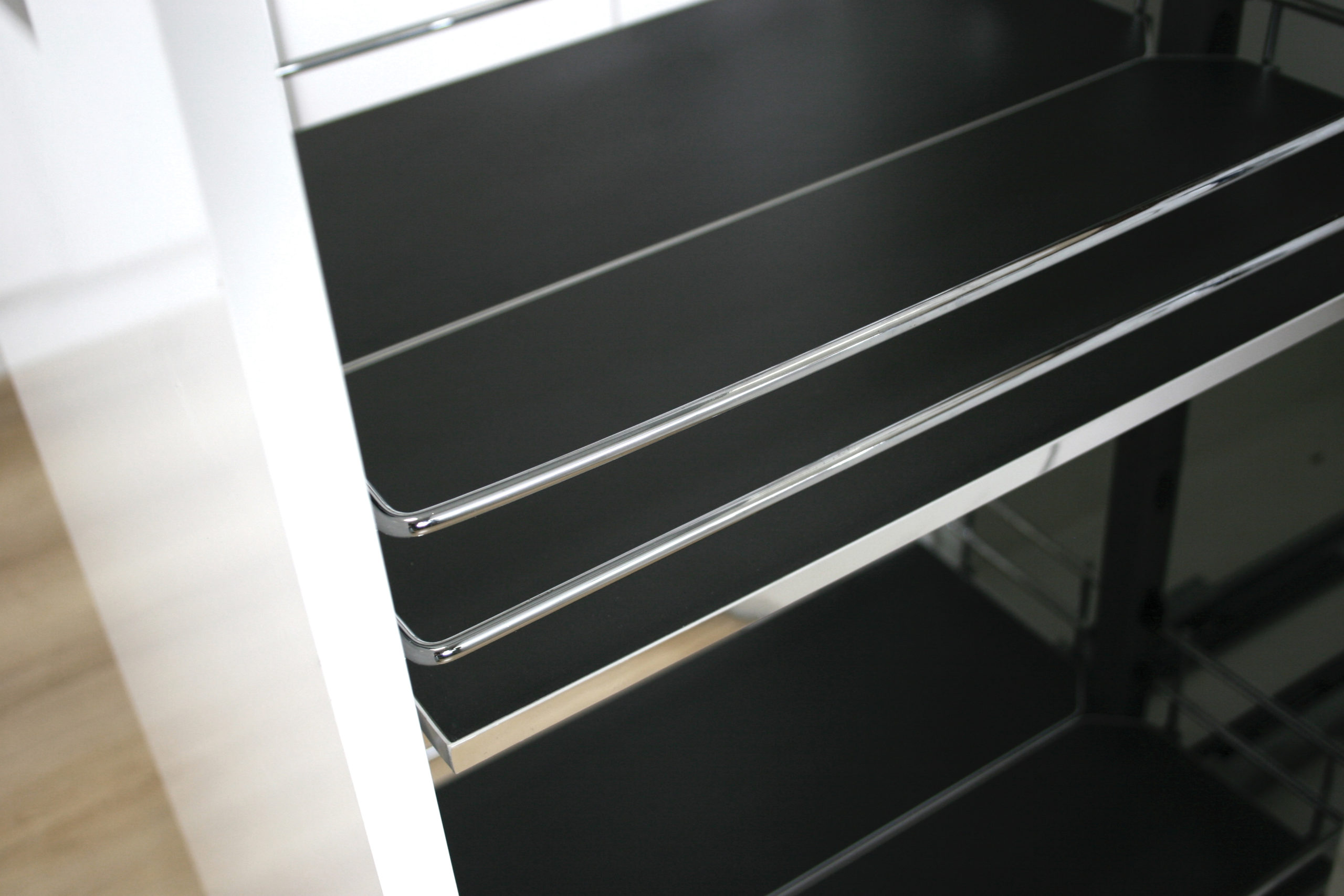 Kolor – stelarz grafitowy, półki metalowe chromowane a dno z płyty w kolorze grafitowym.