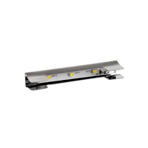 Metalowy klips LED stosowany do podświetlenia półek szklanych (witryny, gabloty, ekspozytory). Grubość szyby 5-8 mm. Wymaga użycia zasilacza 12V DC. Producent Design Light.