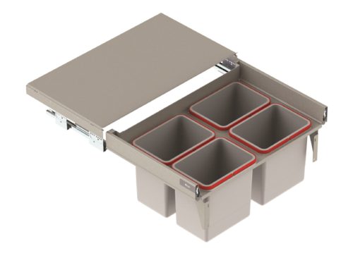 Szuflada na odpady z mocowaniem frontu w komplecie, cztery pojemniki z pokrywą.