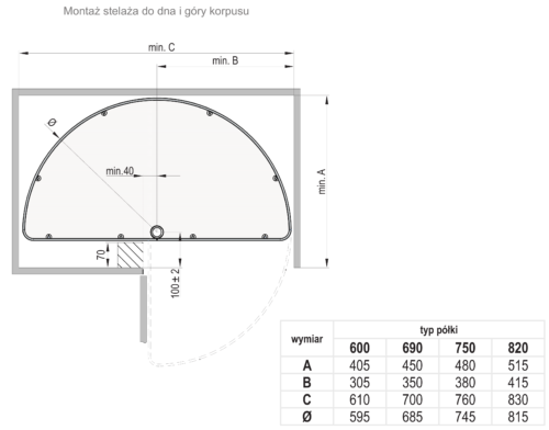 Półka obrotowa 1/2 Linia Variant firmy Rejs – przeznaczona do szafki narożnej dolnej – średnica półki 690 mm.