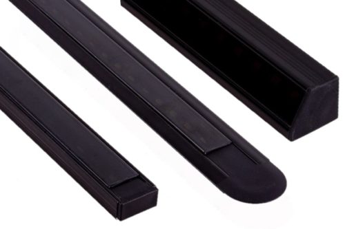 Profile aluminiowe firmy Design Light z kloszem czarnym (przyciemnianym): nawierzchniowy LINE MINI, kątowy TRI-LINE MINI i wpuszczany INLINE MINI XL. Są idealnym rozwiązaniem (razem z taśmą LED na czarnym podkładzie) do zastosowania w  czarnych meblach. Długość 2m.