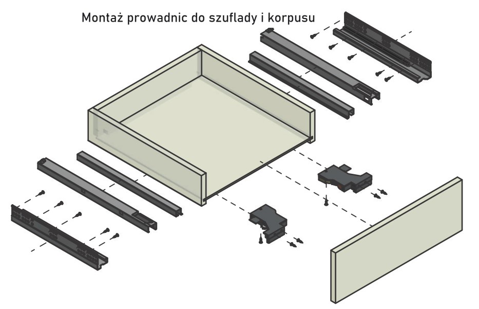 Prowadnica dolnego montażu i pełnego wysuwu z dociągiem. Wyposażona w regulację pionową, poziomą oraz dodatkowo – regulację głębokości, która sprawdzi się gdy występuje większa ilość szuflad obok siebie. Wyrównanie frontów do jednej płaszczyzny odbywa się szybko oraz bezproblemowo.