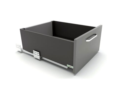 SEVROLLBOX SLIM H= 199 mm to nowoczesny system do budowy szuflad. Prowadnice z cichym domykiem gwarantują miękkie zamykanie. Szuflada posiada regulację frontu umieszczoną wewnątrz szuflady by ułatwić precyzyjne ustawienie.