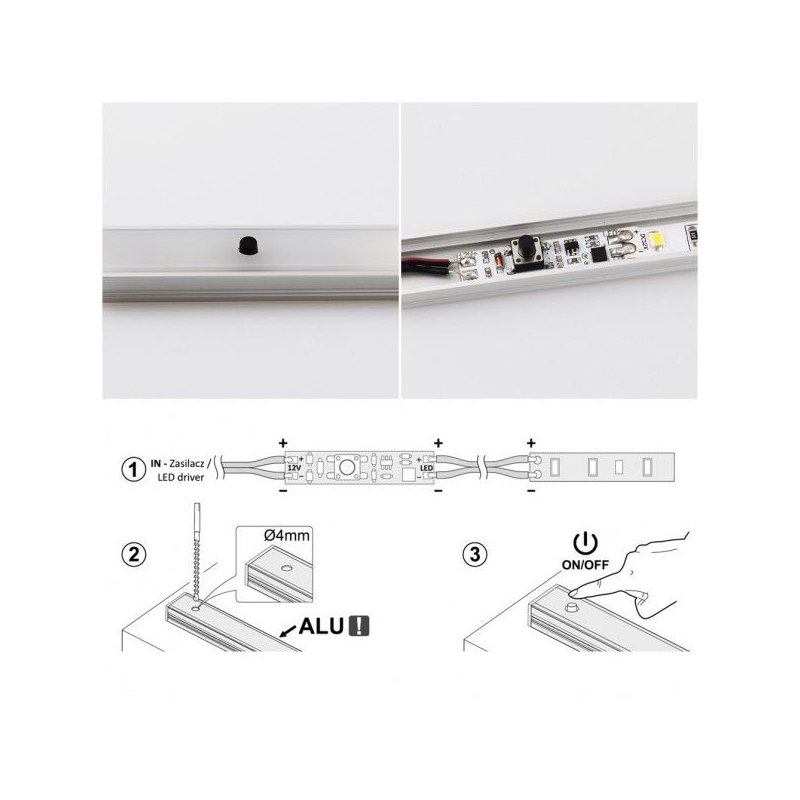 Wyłącznik mechaniczny montowany do profilu LED. Wystarczy do taśmy przylutować płytkę i w kloszu wykonać otwór montażowy na wyłącznik o średnicy 4-5m. Pasuje do profili Design Light: LINE MINI, INLINE MINI.