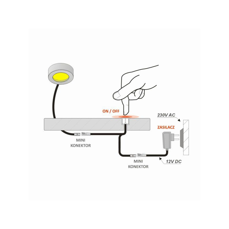 Wyłącznik do LED dotykowy działa poprzez dotknięcie sensora, który powoduje włączanie/ wyłączanie oświetlenia. Długi dotyk wyłącznika powoduje rozjaśnianie lub ściemnianie oświetlenia. Dostępny jest w kolorach: biały, czarny. Producent Design Light.